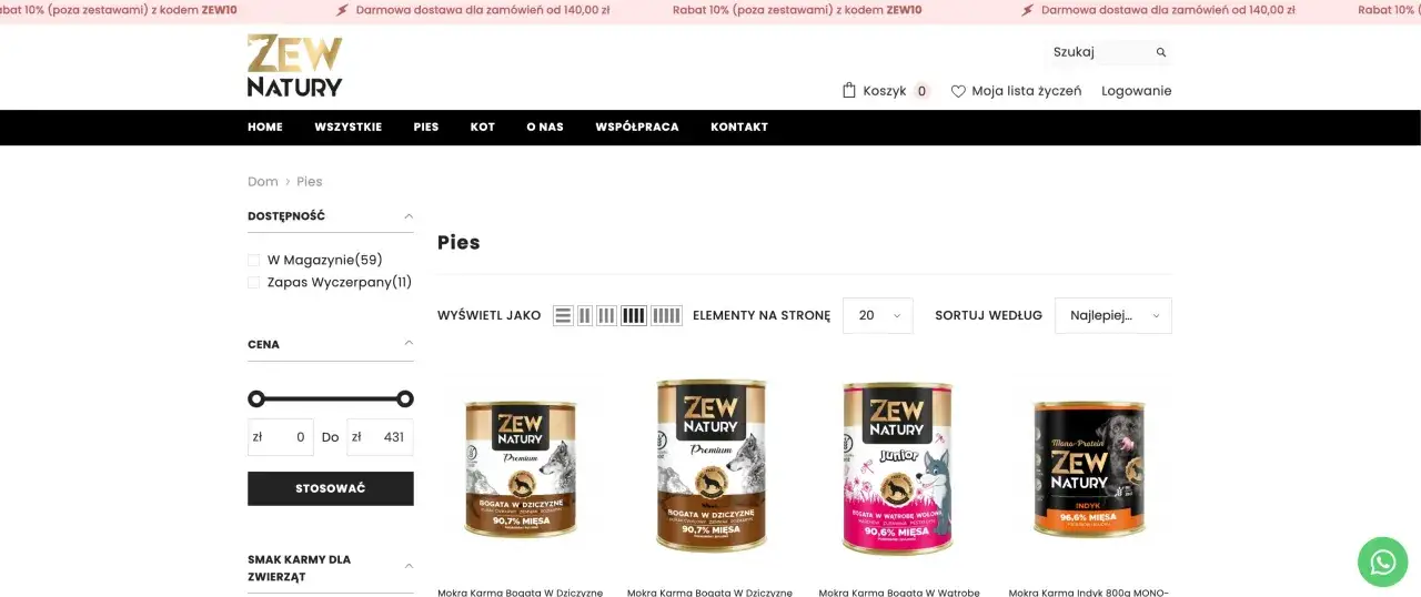 W ich asortymencie znajdziesz imponujący wybór mokrych karm premium, opracowanych tak, aby zaspokoić potrzeby każdego psa – niezależnie od rasy, wieku czy wrażliwości żołądka. Co więcej, Zew-natury dba nie tylko o zdrowie Twojego psa, ale i o Twój portfel – przy zamówieniach powyżej 140 zł gwarantują darmową wysyłkę. To doskonała okazja, by zadbać o miskę swojego pupila kompleksowo i bez dodatkowych kosztów dostawy.